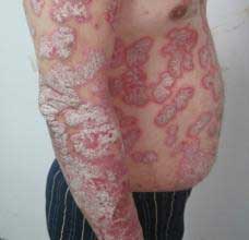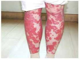 4、红皮型牛皮癣症状:初起时在原有银屑病皮损部位出现潮红,迅速扩延成大片,最后全身呈现弥漫性潮红浸润,在弥漫性潮红浸润中,常有片状正常“皮岛”。
