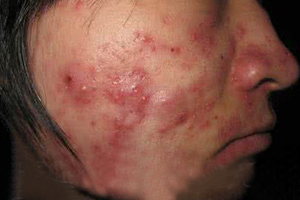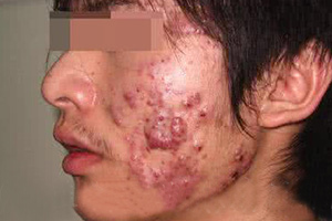 7、恶病性青春痘:皮肤损害为小米粒至蚕豆大小的青红色或紫红色丘疹,脓疱或结节,质地较软,含有脓液或血液。